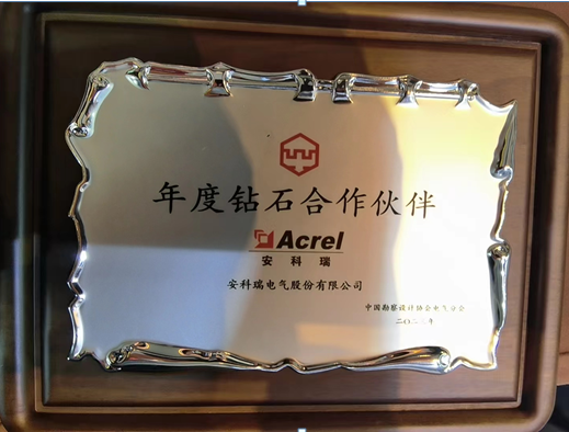 在年度合作伙伴表彰儀式上,黑龍江省設計大師、哈工大院機電總工李曉東,中國院顧問總工陳琪為安科瑞電氣股份有限公司頒發鉆石合作伙伴獎牌。